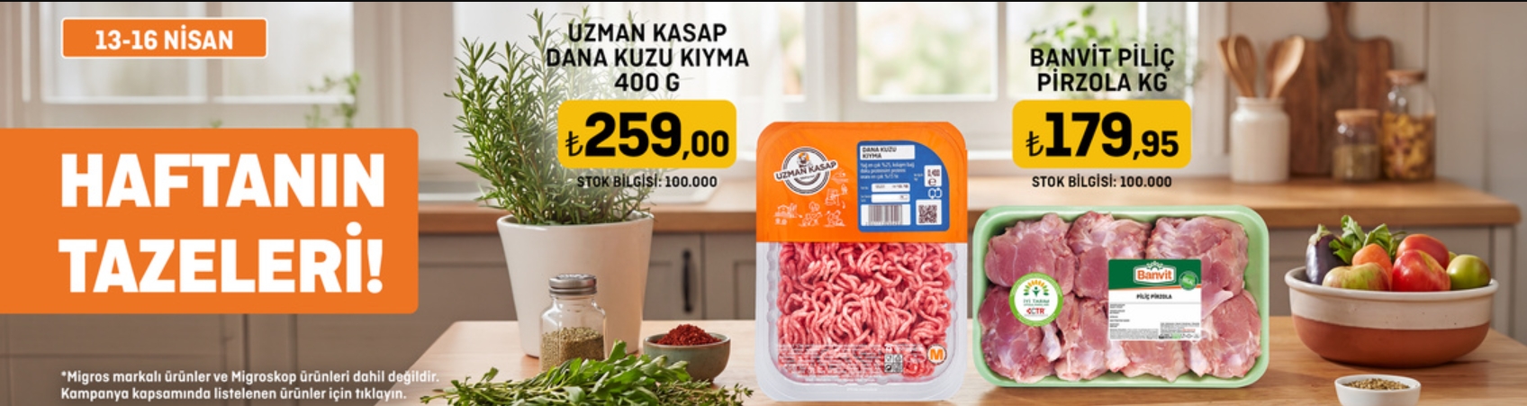 MİGROS Haftanın Tazeleri kampanyası kapsamında bu hafta kırmızı et grubunda Uzman Kasap dana kuzu kıyma 300 gr. 259 TL fiyatıyla dikkat çekiyor. Ayrıca Banvit Piliç pirzola kg fiyatı da Migros’ta sadece 179,95 TL.