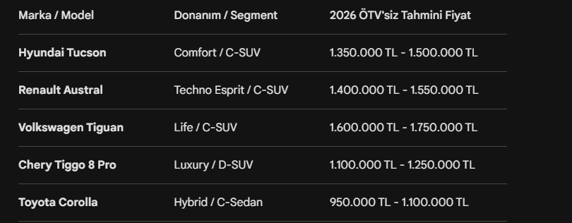 ÖTV muafiyetinde üst sınır limitinin güncellenmesi ile birlikte 2026’da birçok popüler araç ÖTV’siz alınabilecek araçlar listesine girdi. Muafiyet kapsamındaki popüler modeller ise şu şekildedir: