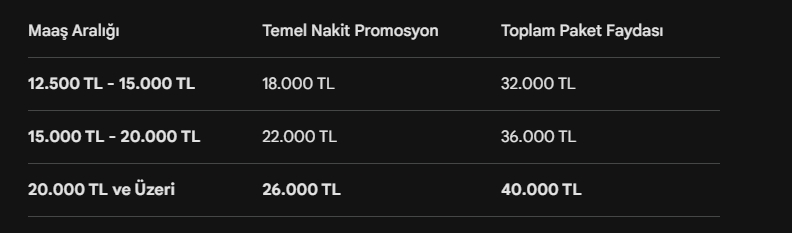 Vakıf Katılım tarafından yapılan açıklamada 40.000 TL’lik emekli promosyon paketinin detayları da paylaşıldı. Buna göre, emekliler maaşını Vakıf Katılım’a taşımaları halinde maaşa ek 26.000 TL’ye kadar nakit promosyon alma şansına sahip olacak. Ayrıca, otomatik ödeme talimatı, kredi kartı kullanım sözü gibi ek şartlarla birlikte emekliye ekstra 8000 TL’lik bonus ödemesi yapılacak. Vakıf Katılım bankası promosyon ve bonusların yanı sıra emeklilere kar payı indirimi ve dosya masrafsız finansman avantajı da sunarak 6000 TL’lik bir maliyet avantajı daha sağlayacak.